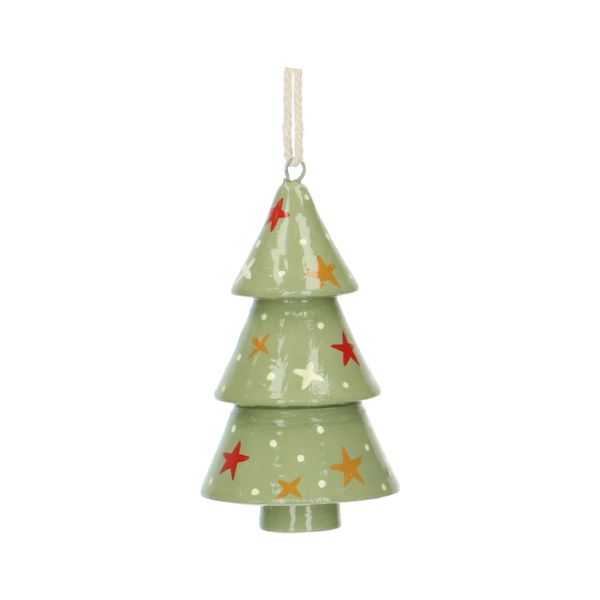Hellgrüner Weihnachtsanhänger aus Papiermaschee in Form eines Weihnachtsbaums mit von Hand gemalten Sternen und Punkten. Kombinieren Sie ihn mit unseren anderen Weihnachtsanhängern und gestalten Sie einen farbenfrohen Weihnachtsbaum. Dieser Anhänger ist unzerbrechlich und leicht.