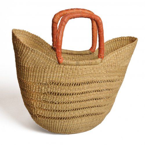 Handgeflochtener traditioneller Korb aus Bolgatanga (Ghana), aus Steppengras mit Ledergriff. Bolga-Körbe werden von Frauen geflochten, die damit ihr eigenes Einkommen verdienen. Der Korb ist auch sehr gut geeignet zur Lagerung, beispielsweise für Spielzeug. Höhe ohne Griff ca. 30 cm , Durchmesser 23 cm, Griffhöhe 18 cm. Da dies ein handgemachtes Produkt ist, kann sich die Größe von Korb zu Korb geringfügig unterscheiden.