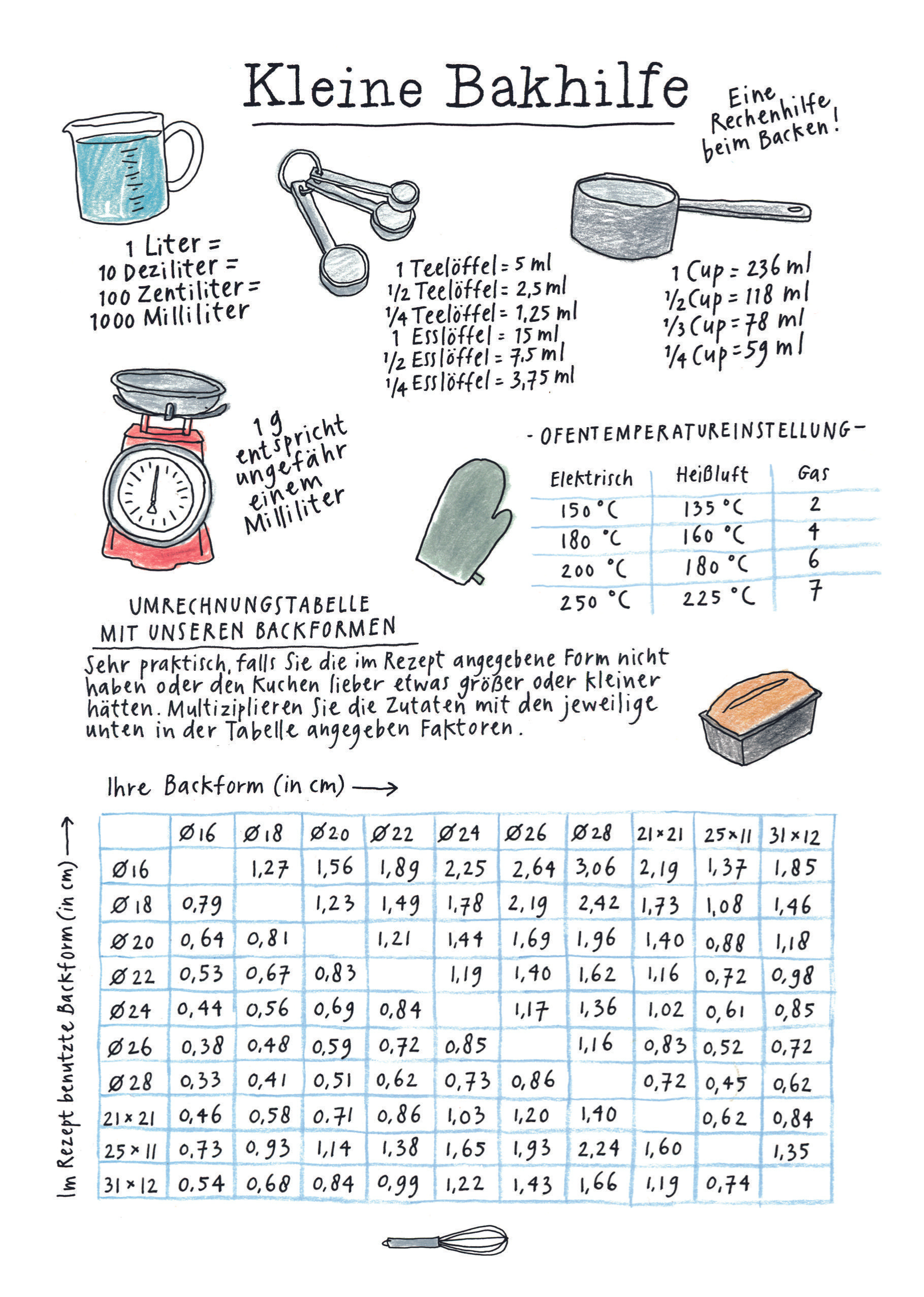 Wissen Sie eigentlich, wie viel Milliliter einem Cup entsprechen? Und was können Sie tun, wenn Sie die im Rezept angegebene Backform nicht haben - aber vielleicht eine größere oder kleinere Größe im Haus haben? Die Backhilfe von Dille ist eine praktische kleine Karte, die Sie an Ihrem Kühlschrank oder Küchenschrank anbringen können. Hübsch ist sie auch noch!