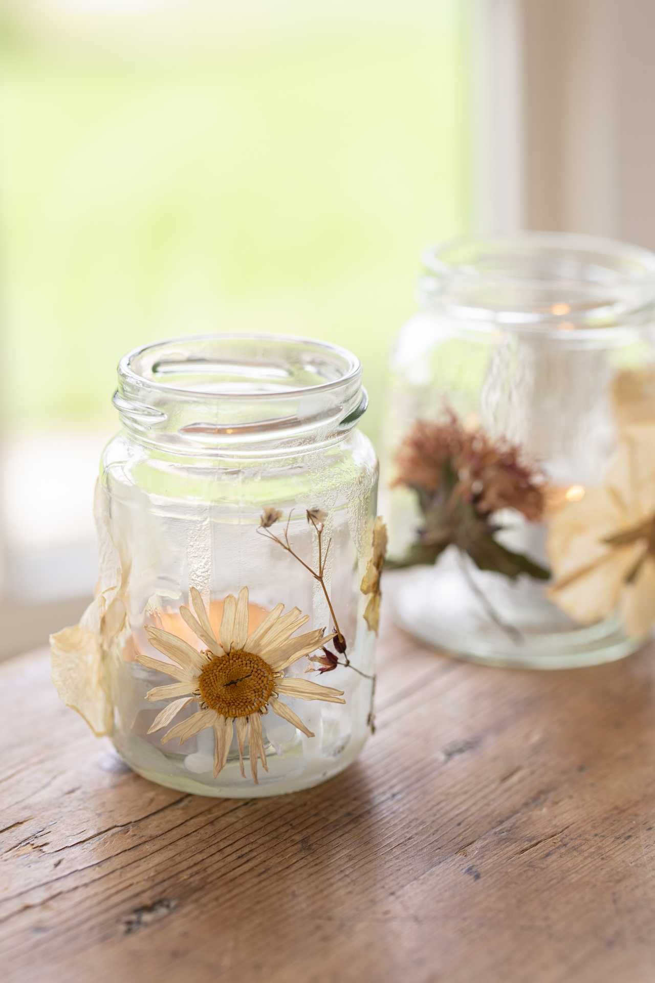 Farbenfroh, stimmungsvoll und eine schöne Manier, leere Glasgefäße wiederzuverwenden: Mit diesem DIY können Sie hübsche kleine Windlichter mit getrockneten Blumen basteln. Für stimmungsvolles Licht an langen Sommerabenden!