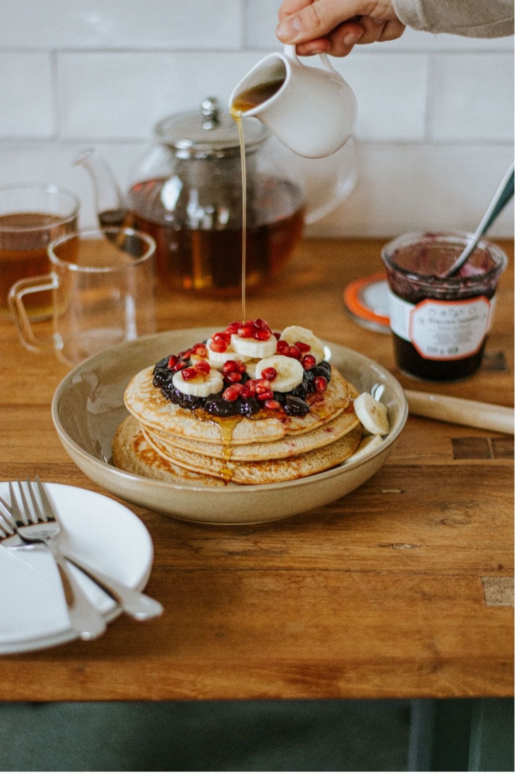 - Einige Pfannkuchen stapeln, Marmelade, Banane und Granatapfelkerne darauf verteilen und mit Ahornsirup übergießen.