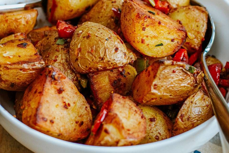 - Wenn die Kartoffeln fast fertig sind, die Gewürzmischung und die Spitzpaprika hinzufügen und weitere 10 Minuten braten. Die Frühlingszwiebeln für die letzten 2 Minuten dazugeben.