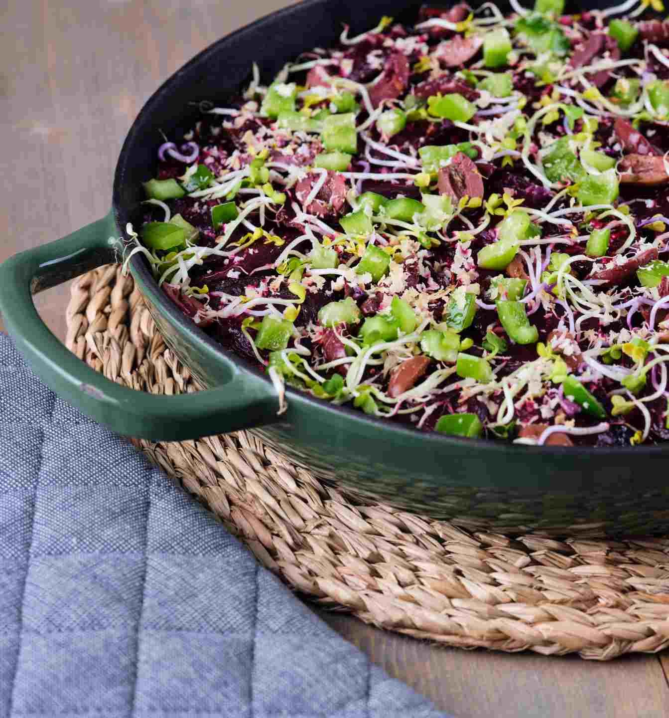- Die Paprikawürfel über das Gericht streuen. Dann das Sprossengemüse, das Olivenöl und die halbierten Oliven darüber verteilen.