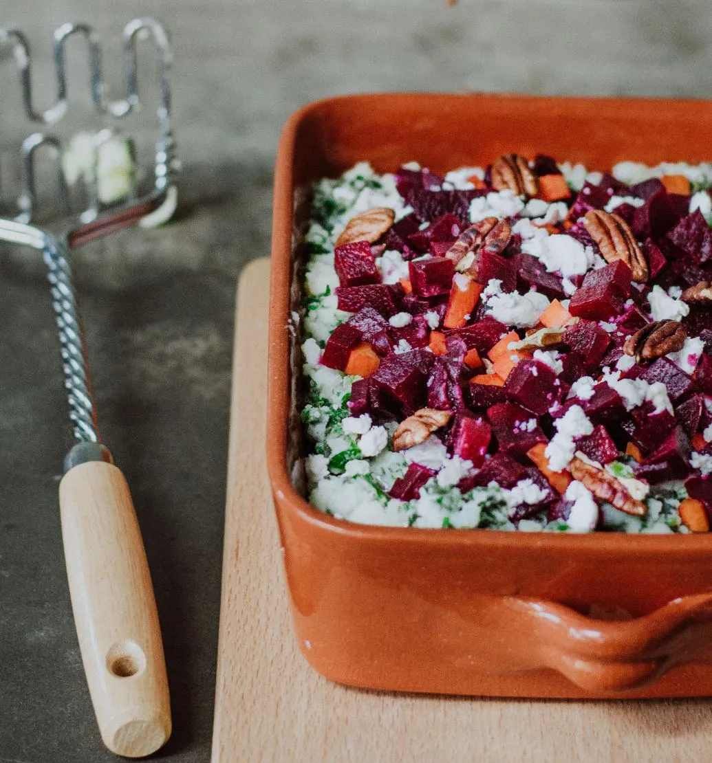- Streuen Sie die Rote Bete- und Mohrrübenwürfeln und die Pekannüsse darüber.