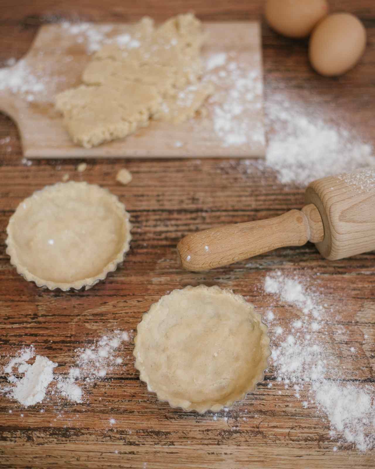 - Die Förmchen einfetten, mit Mehl bestäuben und mit Teig auslegen. An den Rändern gut andrücken.