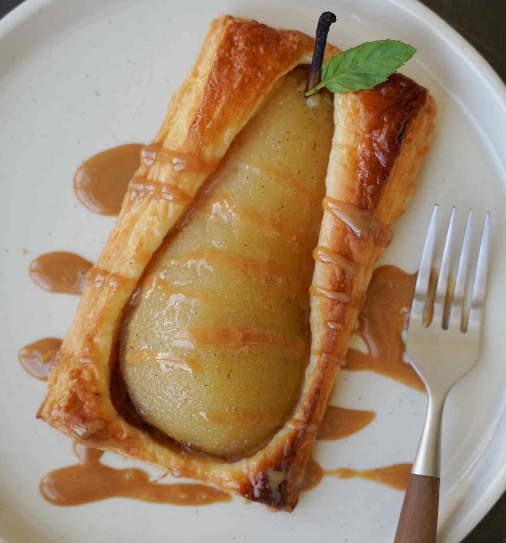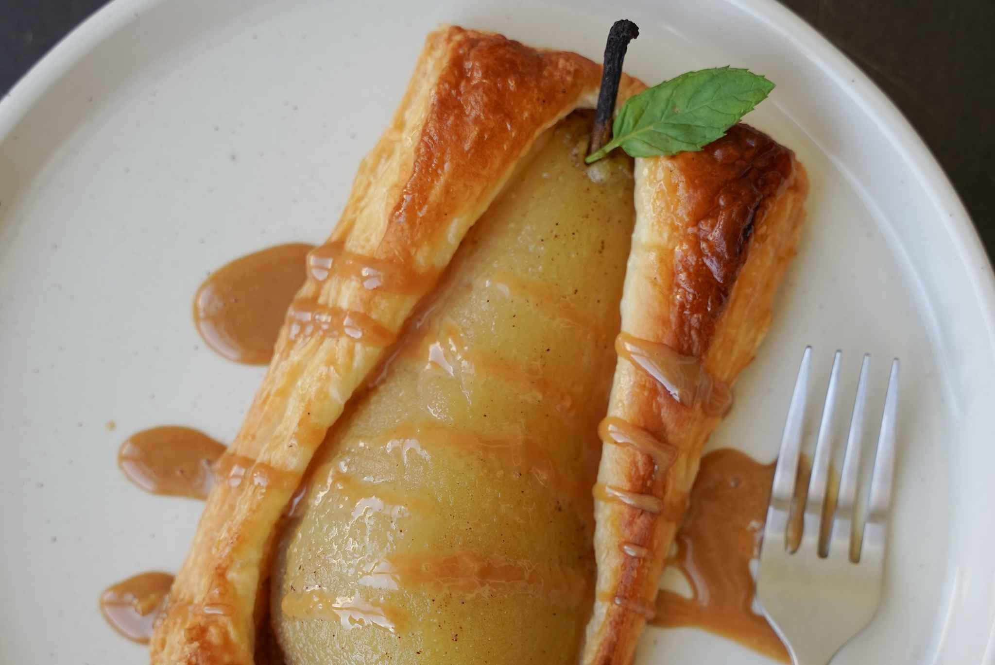 - Das Gebäck aus dem Ofen nehmen und über jede Birne etwas warme Karamellcreme gießen.