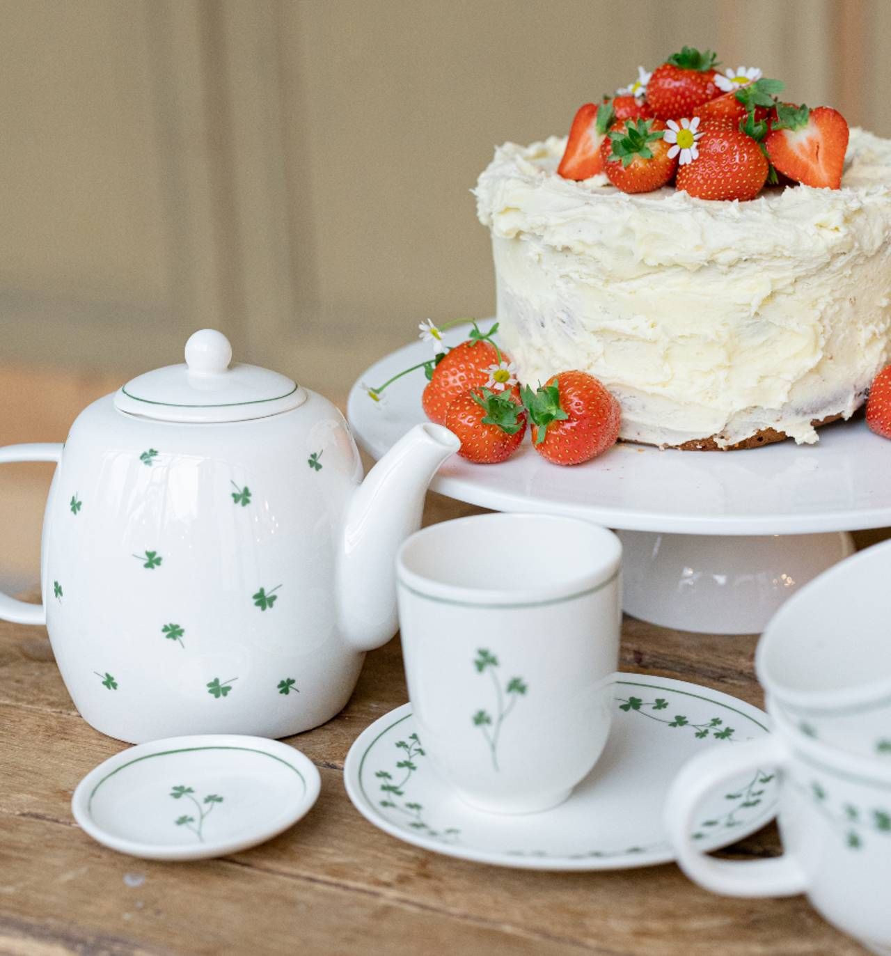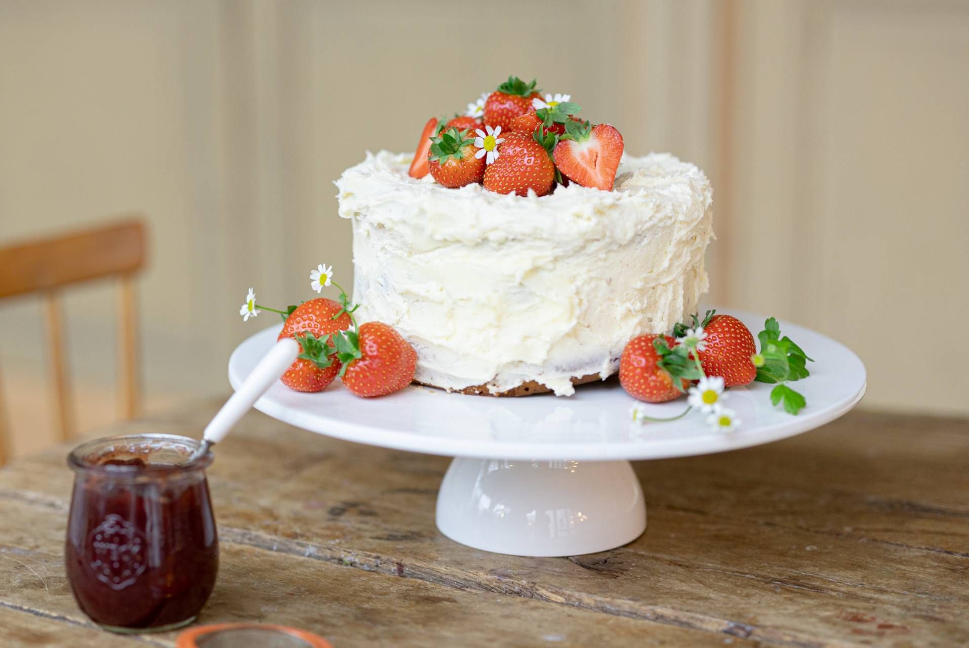 - Jetzt die ganze Torte mit der Buttercreme bestreichen und mit Erdbeeren garnieren.