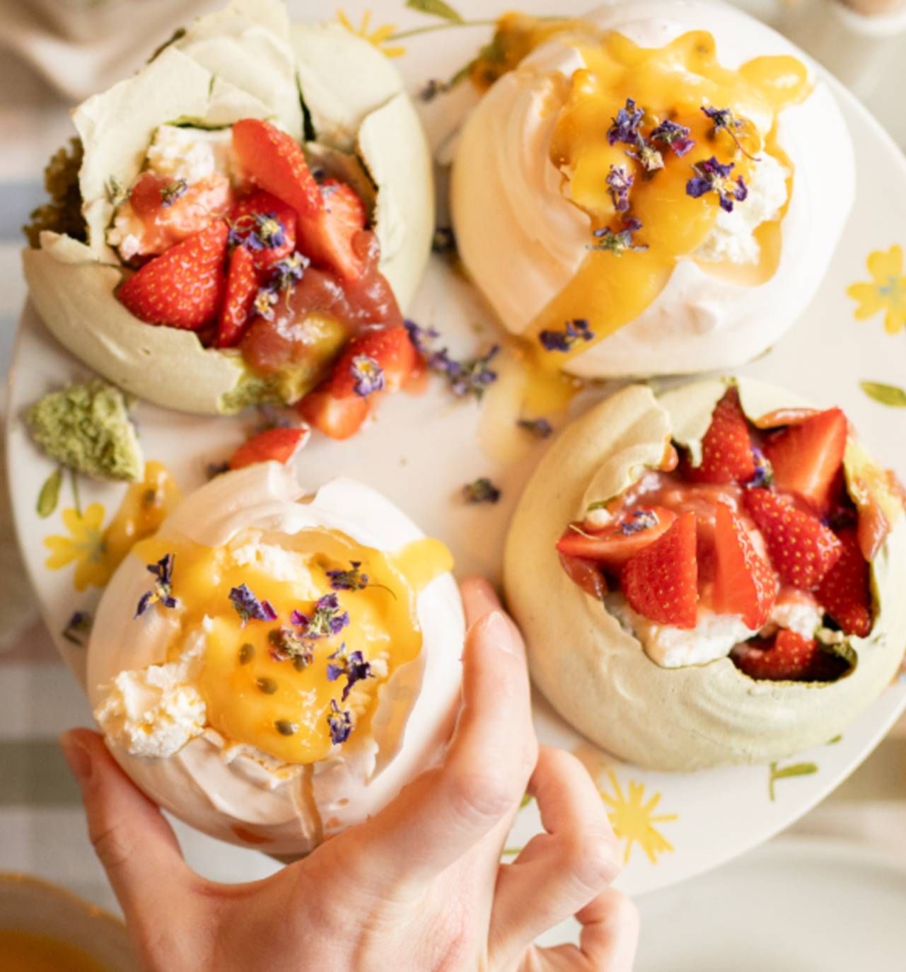 - Die Mini-Pavlovas mit Erdbeeren, Passionsfrüchten und essbaren Veilchen garnieren.