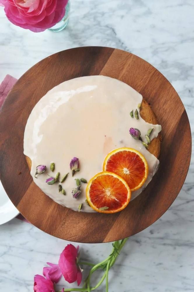 - Gießen Sie die Glasur über den abgekühlten Kuchen und garnieren Sie nach Herzenslust mit Orangenscheiben, getrockneten Rosenblüten und Kardamom.