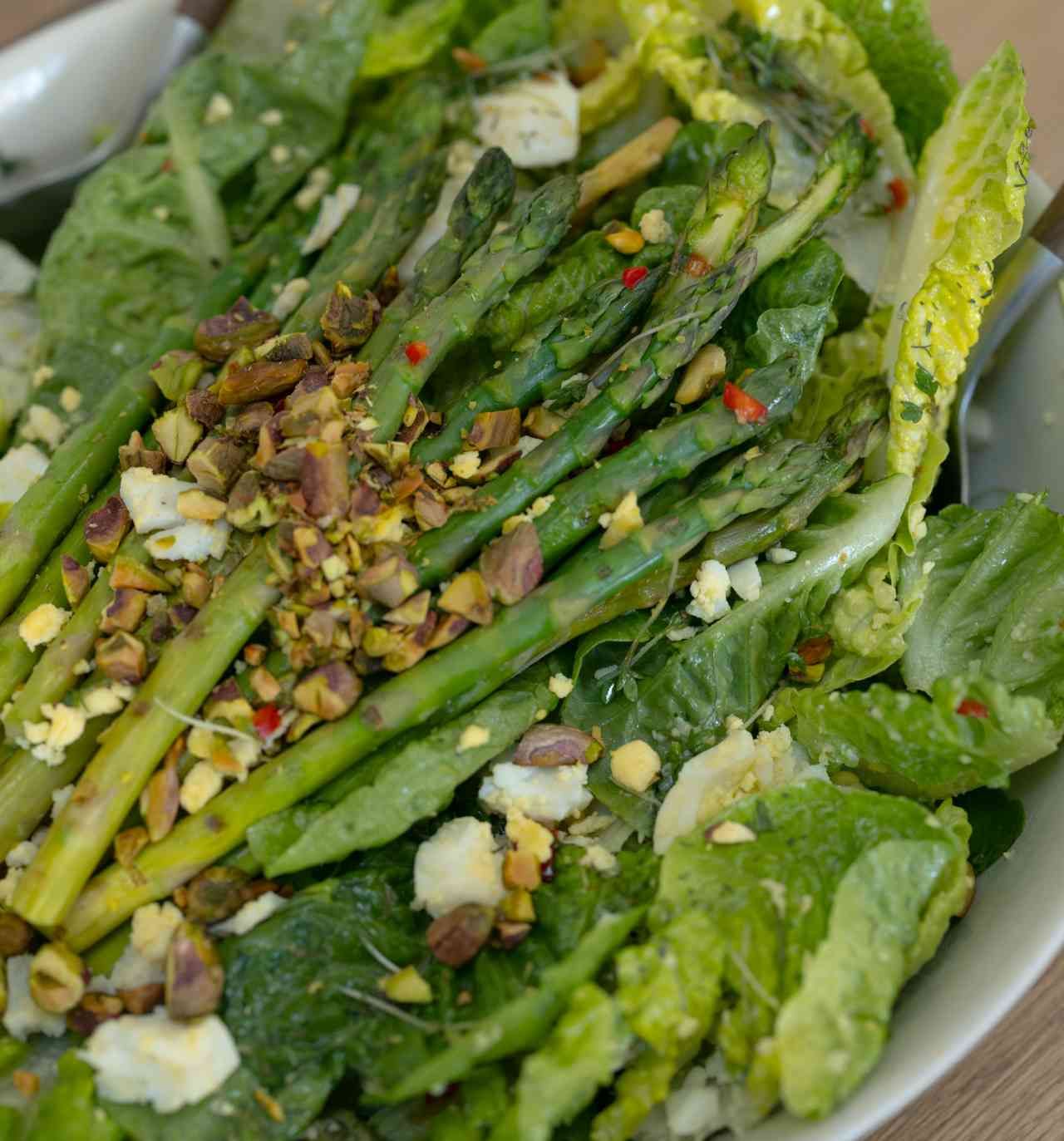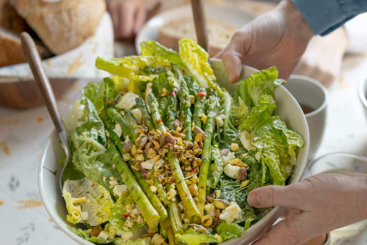 - Den Salat auf den Tellern verteilen, den Spargel darauflegen und mit Eier-Mimosa und Pistazien bestreuen.
