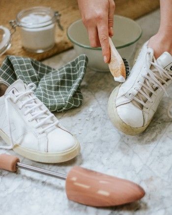Weiße Sneakers werden wieder sauber mit einem Brei aus Soda und etwas Wasser. Reiben Sie die Sneakers mit Hilfe einer kleinen Schuhbürste damit ein, lassen Sie das Ganze kurz einziehen und entfernen Sie den Brei anschließend mit einem sauberen Tuch. Und Schnürsenkel werden wieder weiß, indem Sie sie mit Natriumpercarbonat bleichen.