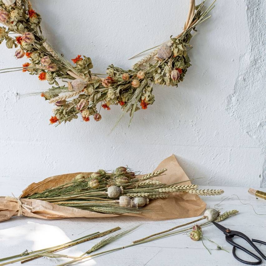 Mit Trockenblumen kann man mehr machen, als sie nur in eine Vase zu stellen. Sie können zum Beispiel einen schönen Kranz daraus machen oder die Trockenblumen zur Dekoration von eingepackten Geschenken verwenden.