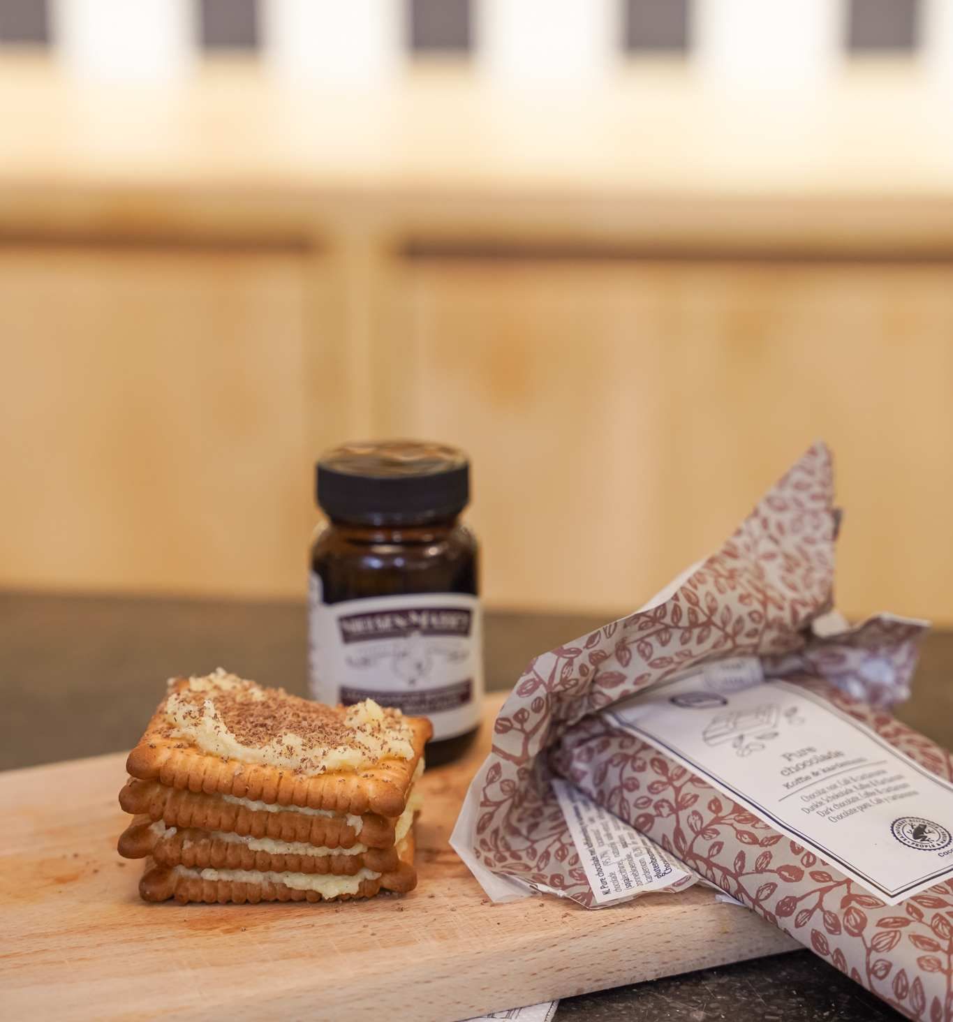 - Legen Sie mehrere Kekse nebeneinander auf ein Holzbrett und bestreichen Sie sie mit einer Schicht Buttercreme.