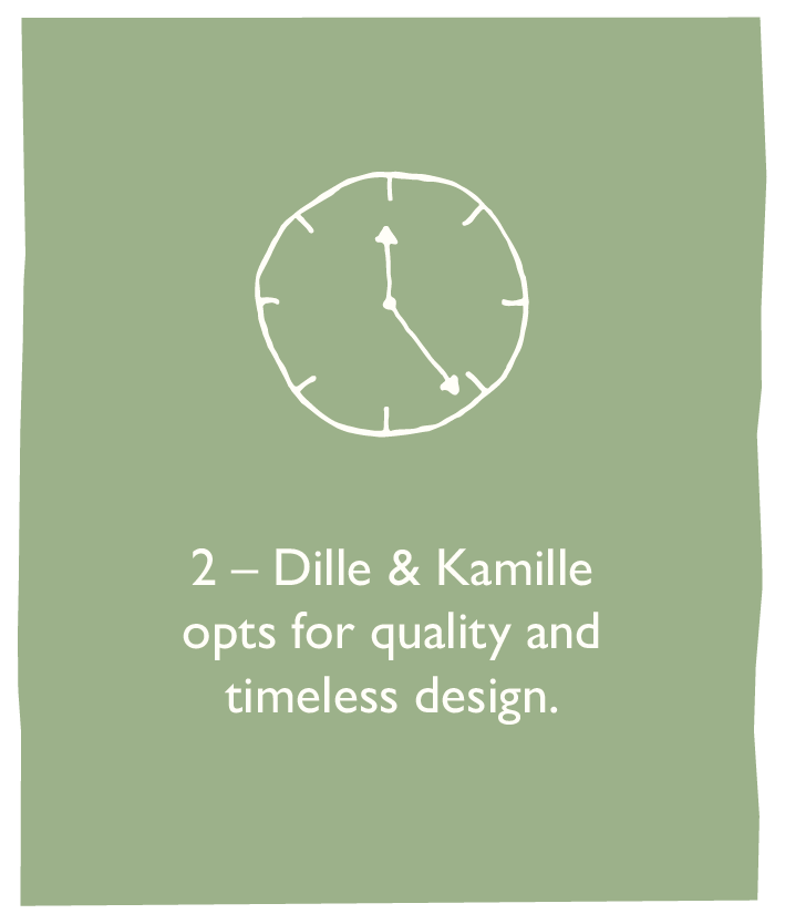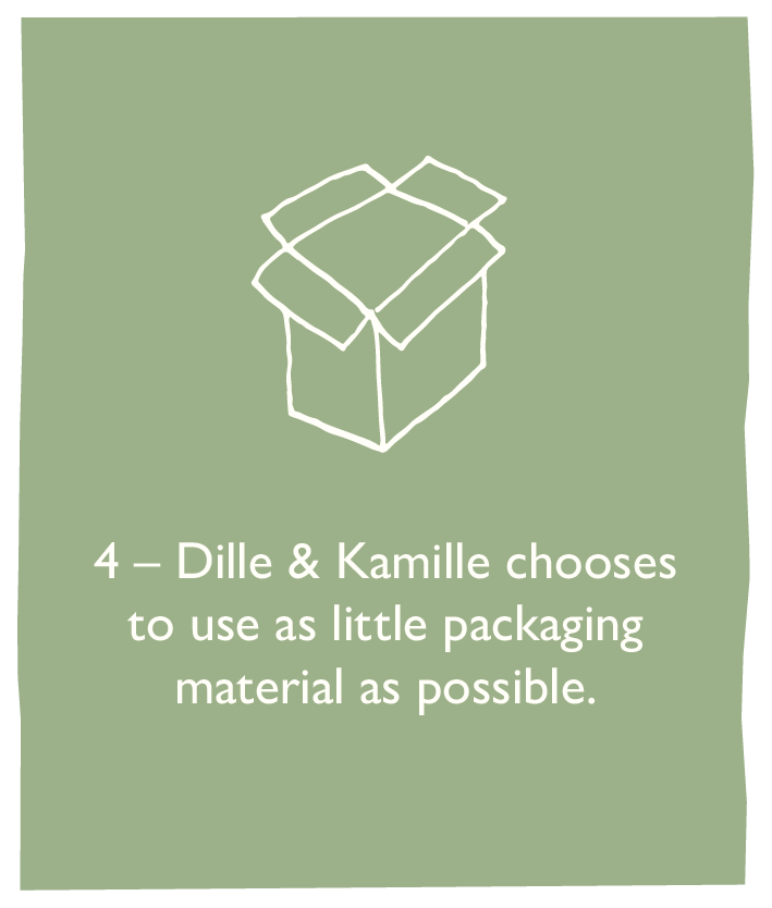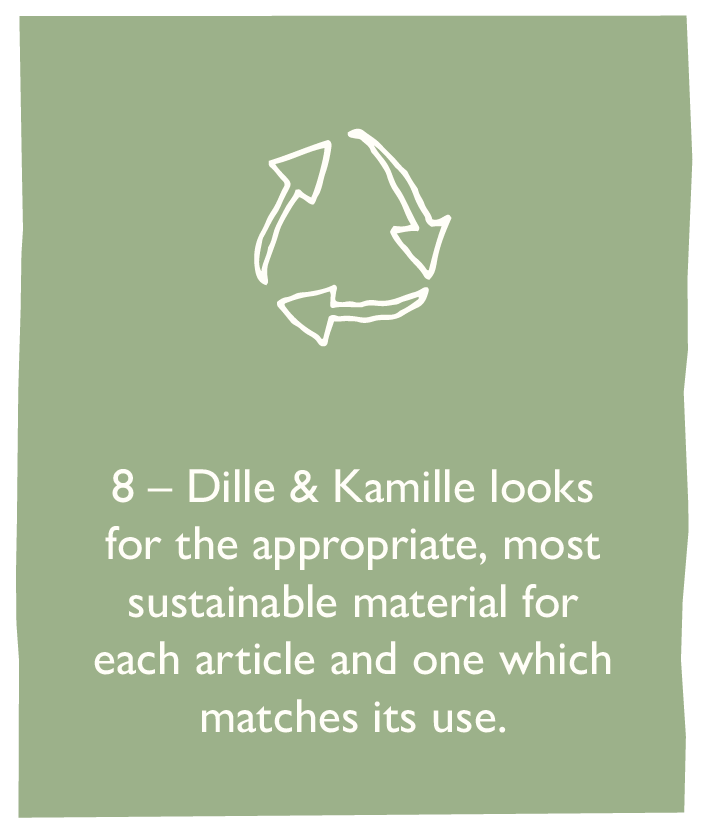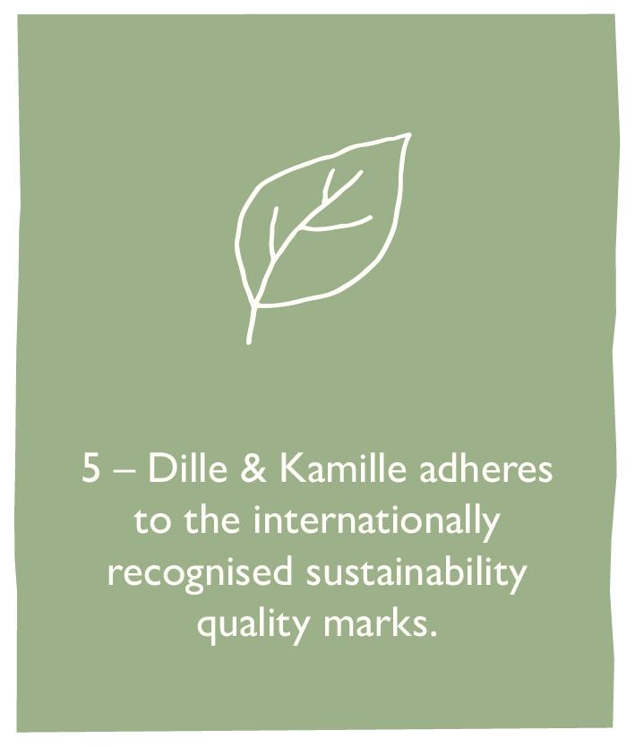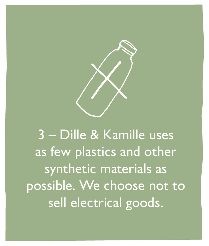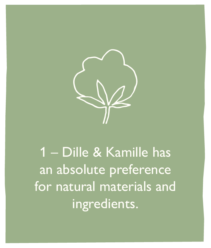 Seit der Gründung von Dille & Kamille setzen wir bei der Zusammenstellung unseres Sortiments auf Qualität und zeitloses Design mit einer absoluten Vorliebe für natürliche Materialien und Zutaten. Wir verwenden so wenig Plastik und andere synthetische Materialien und so wenig Verpackungsmaterial wie möglich. Wir orientieren uns an den international bekannten Gütesiegeln für Nachhaltigkeit, wollen einen fairen Preis für alle in der Kette und suchen für jeden Artikel das richtige nachhaltigste - und optimal geeignete - Material.