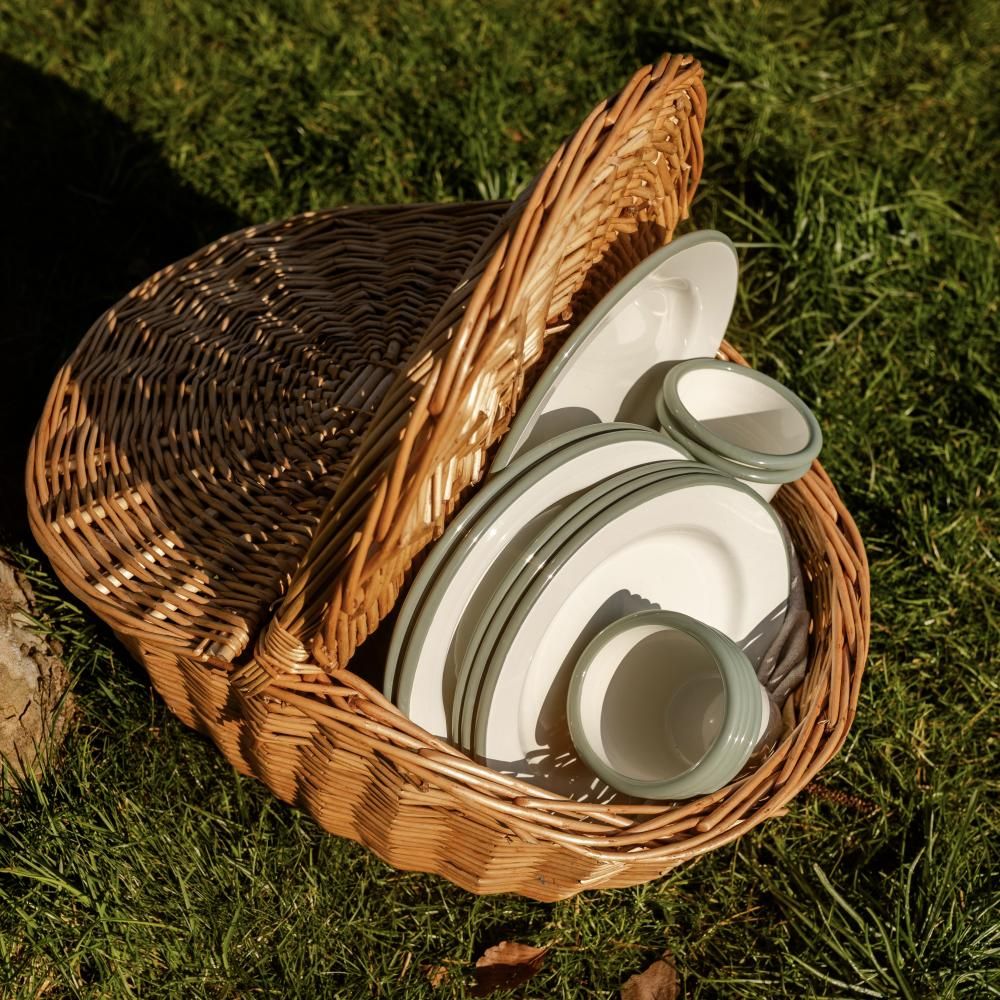 Dieses Paket enthält einen Picknickkorb sowie 6 Emaille-Becher und -Teller. Füllen Sie den Korb und genießen Sie ein gemütliches Picknick!